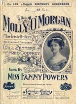 Stage and Film Interpolations Interpolated by Ella Retford in pantomime Jack And Jill (Theatre Royal, Sheffield, December 1909); by Lilian Drake in pantomime Cinderella (Aquarium Theatre, Yarmouth, January 1910); by Daisy Wood in pantomime The House That Jack Built (Opera House, Cheltenham, February 1910). Interpolated in films Gaiety George (1946); Wonder Woman (2017). __________________ Note 1 “‘Molly O’Morgan,’ Irish girl whose romance inspired a song,” Nottingham Evening Post, 21 February 1929. |