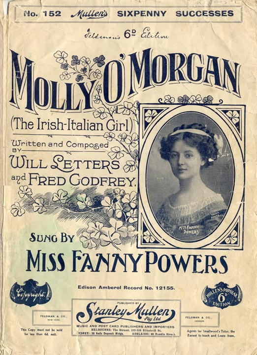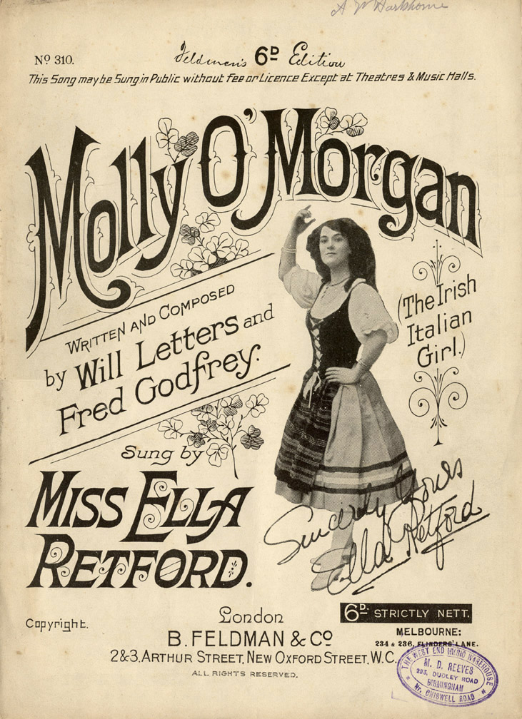 Fred Godfrey & Will Letters — London: Bert Feldman Melbourne: Stanley Mullen, 1909; copyright renewed by Godfrey, 1936 [Library of Congress]. Note: Society of Composers, Authors and Music Publishers of Canada (SOCAN) apportions royalty shares as follows: Godfrey (12.5%), “non copyright” (75.0%), B. Feldman & Co. (12.5%) * * * * * * * * * * * * The “hook” of this huge success was combining the popular fads for Irish and Italian “ethnic” songs in one multicultural mix — and throwing in the inevitable organ for good measure. Not very politically correct now, but no one minded at the time. One story has it that the song was inspired by a real-life Molly O’Morgan, the daughter of an Irish mother and an Italian father, who, complete with organ, was a street performer in various continental European watering holes in the 1890s. While in Monaco around the turn of the century, she caught the attention of the 71-year-old Duke Medici-Sinelli, who, captivated by her sweet Irish smile and long brown tresses, married her. She ended her life in Hungary in 1929 as the widow Duchess Maria della Casa Medici-Sinelli.1 Ella Retford, above all, put the song over. One venue she did so was the Theatre Royal, Sheffield, where she sang it in the 1909 Christmas pantomime Jack And Jill: