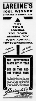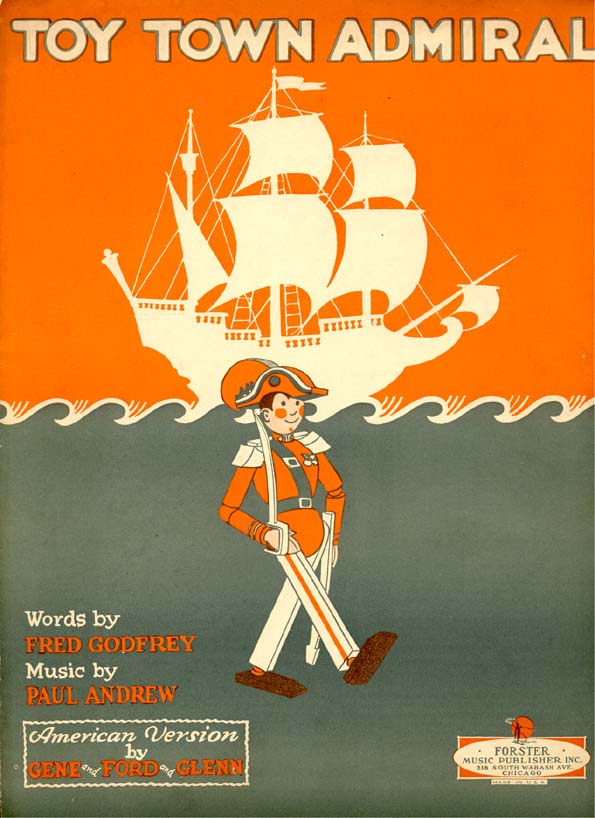 Featured in numerous pantomimes across the British Isles in the 1928/29 season and again the following years, Toy Town Admiral was yet another of Fred Godfrey’s comic specialties, this time in the provision of lyrics for Paul Andrews’s jaunty melody. Among its many performers were Wally Black & His Juveniles in pantomime Robinson Crusoe, Queen’s, Dublin (December 1928); The Fisher Girls, Opera House, Manchester (January 1929); Lollie Holt & Her Musical Hussars (May 1929); Jan Hurst & His Band, Aquarium, Brighton (October 1929); Florence Lemon & Dolly Mountford’s Revuette Girls in pantomime Robinson Crusoe, Opera House, Belfast (January 1929); Etta Ray in pantomime Sinbad, Royalty, Chester (January 1929); Allan Rochester in revue Hot And Bothered (1928); and Joy Vane in pantomime Robinson Crusoe, Grand, Oldham (January 1929). Also interpolated in pantomimes Sinbad, Olympia, Dublin (January 1929); and Humpty Dumpty, Grand, Fulham, London (January 1929). As well, in January 1929, the Lillian Grace Dancers performed it in Brussels, and the Sherman Fisher troupe introduced it to audiences at the famed Moulin Rouge in Paris.