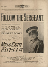 “At Weston-super-Mare, Doris Dosleigh is successfully featuring...‘Follow The Sergeant’” (“Song Notes,” The Stage, 3 June 1915, p. 16). Mabel Medrow sang it in the revue All Trumps, at Her Majesty’s, Dundee, and at the Tivoli, Hull (August 1915), where she performed it “in a military uniform, with the proper amount of insouciance and ‘go’” (Hull Daily Mail, 10 August 1915, p. 3). Dorothy Millar favoured it in the pantomime Jack And The Beanstalk, The Borough, Stratford, London (December 1915) — “Miss Millar is an artist in all she does, and whether singing, acting, or dancing, displays a knowledge of the essentials of pantomime that has an important bearing on the real success achieved. Her numbers, all delivered with vim and point, include...‘Follow the sergeant’” (The Stage, 30 December 1915, p. 28). Esta Stella sang it in the revue Hullo! Everybody, Hippodrome, Derby (May 1915), at the Empire Palace, Edinburgh (June 1915), where she had the “assistance of a khaki chorus” (Scotsman, 8 June 1915, p. 7), and at the Hippodrome, Lewisham (October 1915).